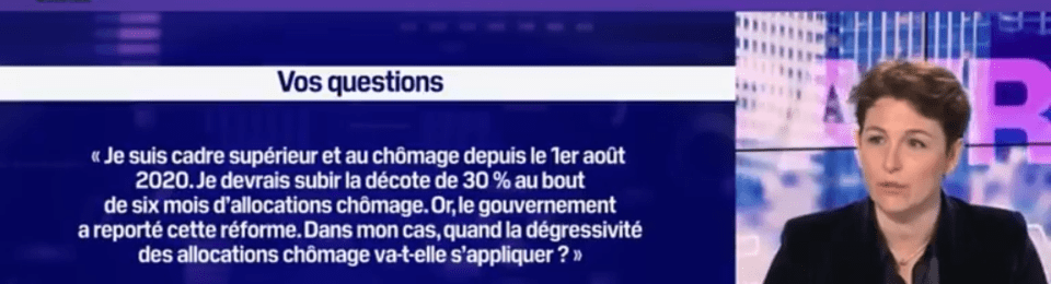 Du coup, quand la dégressivité de 30% sera-elle effectivement appliquée ? Parce que pour l’heure, on l’a vu, les premiers concernés par la réforme (chômage depuis le 1er novembre 2019) ne se sont toujours pas vu appliquer la baisse de 30% de leur indemnisation chômage… Tout dépend de la date de la mise au chômage.
